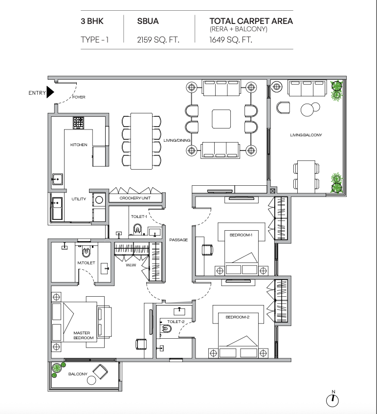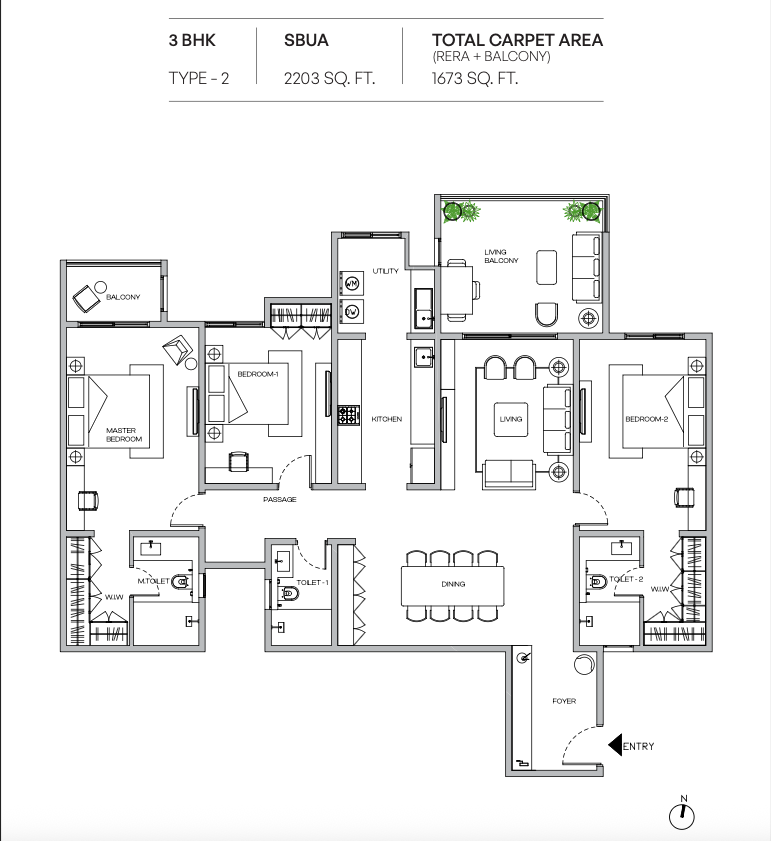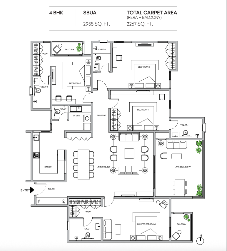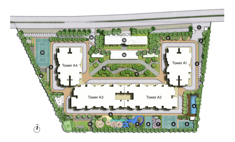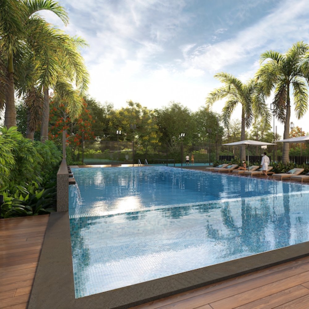 Each home features large living balconies, walk-in wardrobes, and spacious master suites – perfect for those who value comfort and elegance. The project offers 30+ world-class amenities, including a temperature-controlled pool, tennis court, clubhouse, organic waste management, and more – all nestled within a community that boasts ~74% open space.
